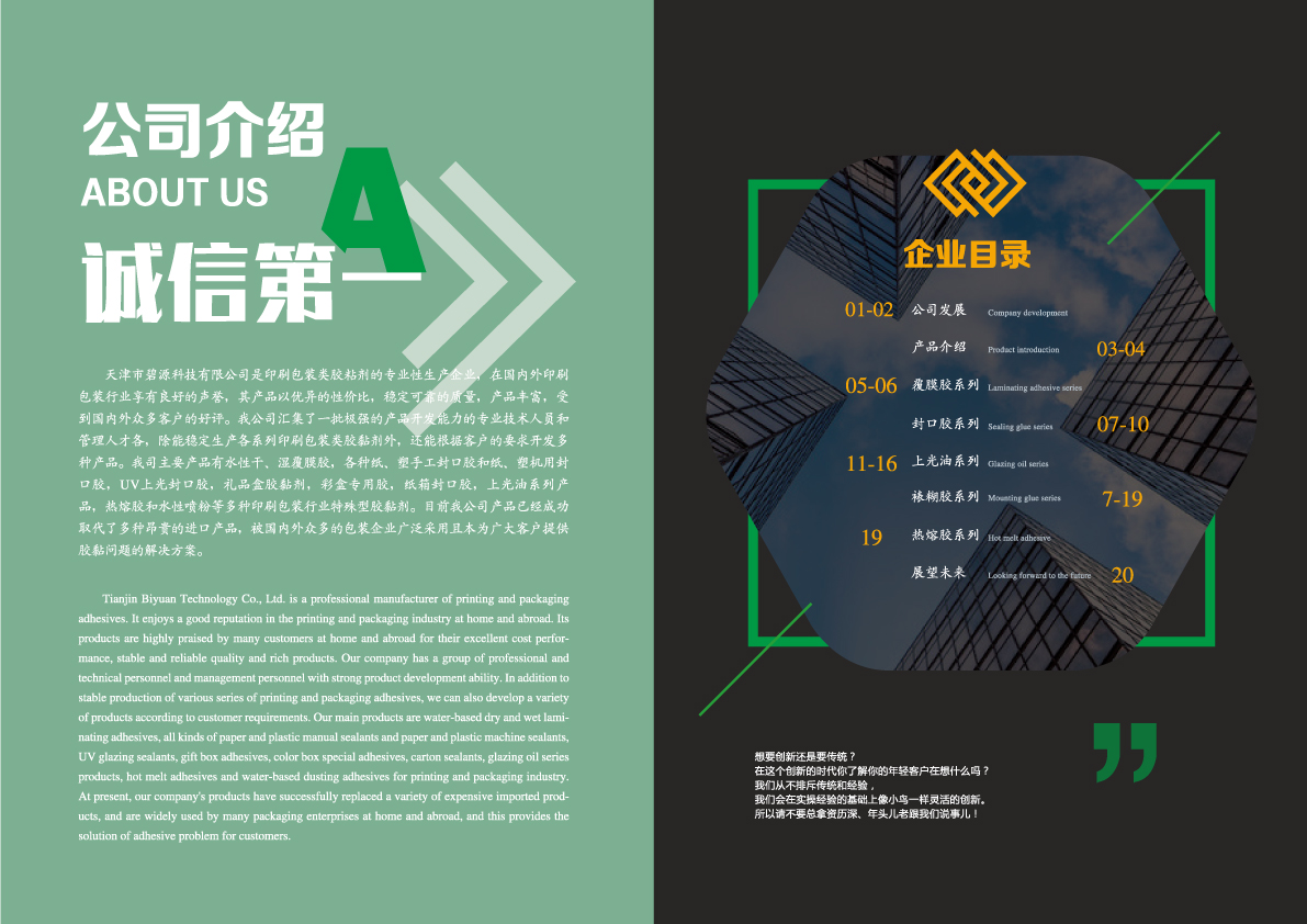 天津市碧源科技有限公司是印刷包装类胶粘剂的专业性生产企业,在国内外印刷包装行业享有良好的声誉,其产品以优异的性价比,稳定可靠的质量,产品丰富,受到国内外众多客户的好评。我公司汇集了一批极强的产品开发能力的专业技术人员和管理人才,除能稳定生产各系列印刷包装类胶黏剂外,还能根据客户的要求开发多种产品。我司主要产品有水性干、湿覆膜胶,各种纸、塑手工封口胶和纸、塑机用封口胶,UV上光封口胶,礼品盒胶黏剂,彩盒专用胶,纸箱封口胶,上光油系列产品,热熔胶和水性喷粉等多种印刷包装行业特殊型胶黏剂。目前我公司产品已经成功取代了多种昂贵的进口产品,被国内外众多的包装企业广泛采用目为广大客户提供胶黏问题的解决方案。